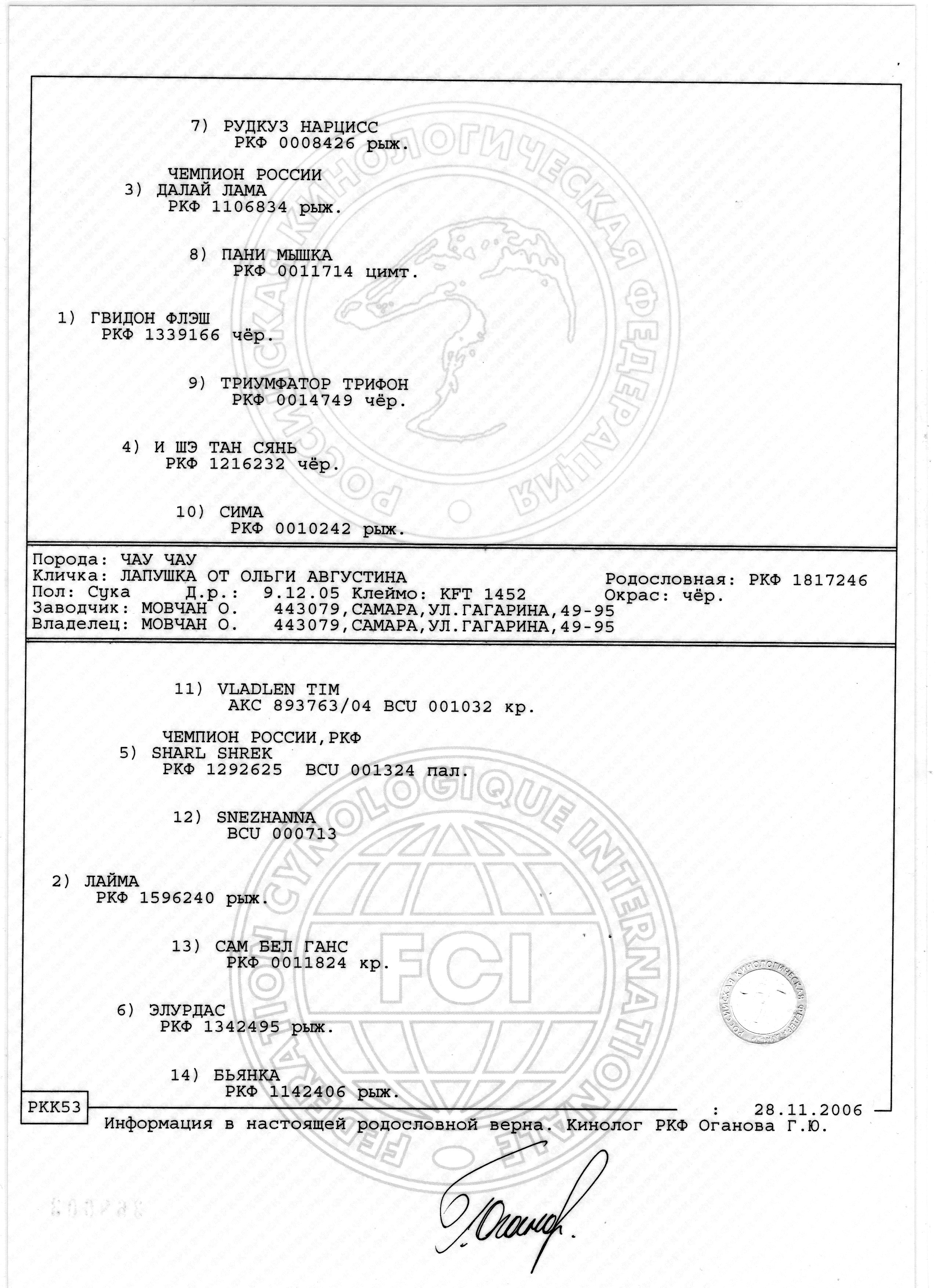 - Имя по родословной: Лапушка от Ольги Августина