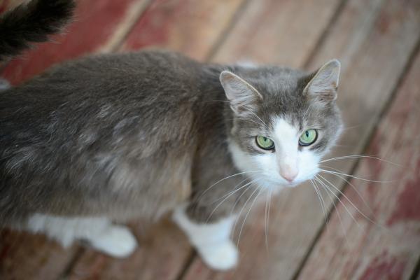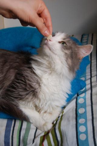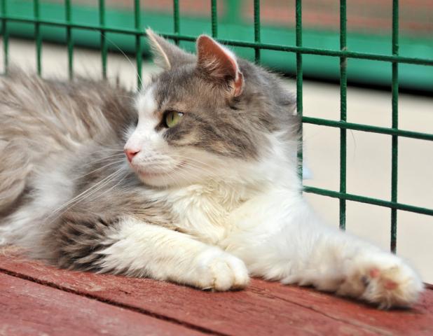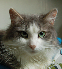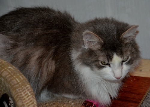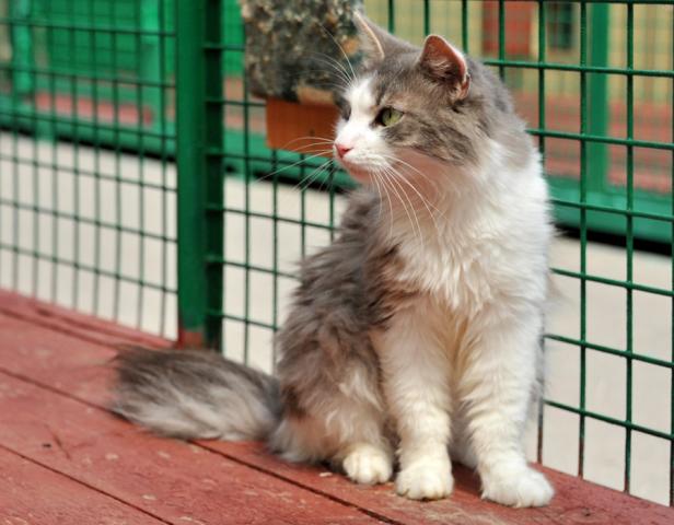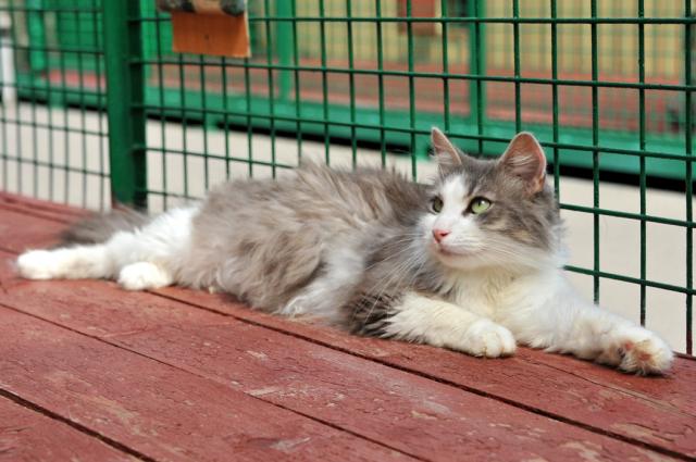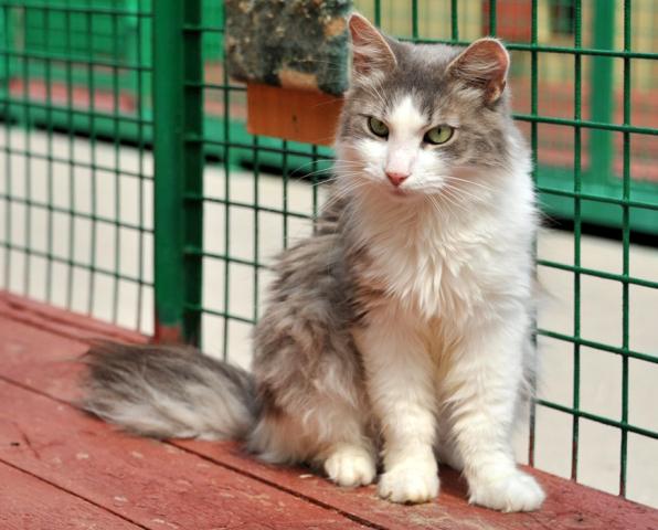 Глядя на красивого некрупного Гришу с изумительными зелеными раскосыми глазами и чудесной пушистой серо-белой шубкой, как-то сразу забываешь, что он уже вполне взрослый кот, хочется ласково величать его только Гришенькой.