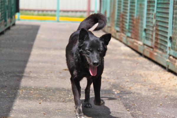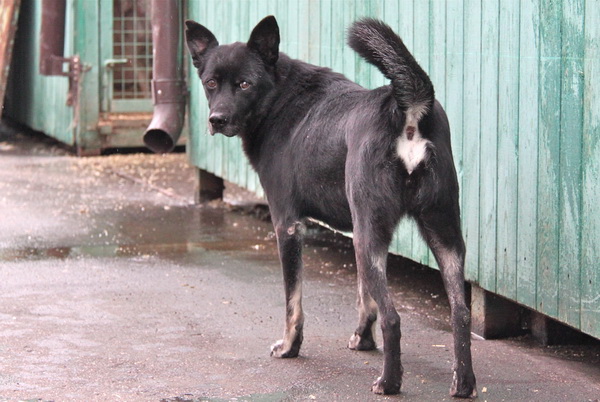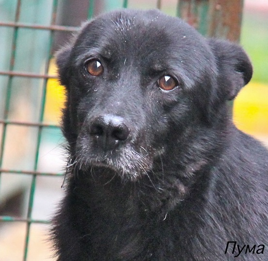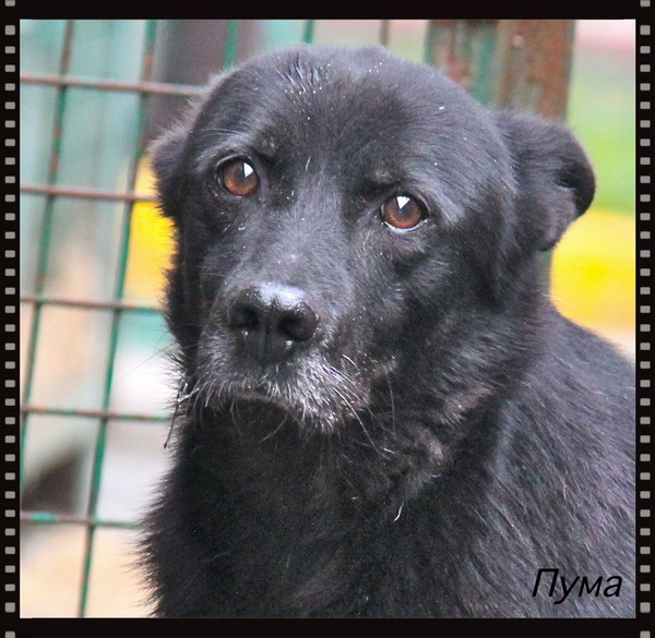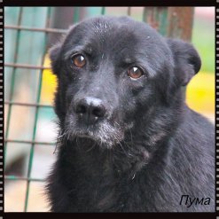 Пума - средняя девочка, черного окраса, короткошерстная. Она добрая, тихая и спокойная, ласковая, не агрессивная к другим собакам и к не знакомым людям. Очень трогательно относится к коротким мгновениям общения с человеком, тихо подходит к рукам, гладится и грустно смотрит в глаза, не навязчива. В вольере живет с такой же черненькой подружкой. Они вместе выбегают на прогулку и бегают вдоль рядов, и им этого хватает для полного приютского счастья. На общий выгул не ходят, им этого не хочется, а мы не заставляем. Они ценят наше время и стараются быстрее нагуляться и послушно вернуться в свой вольер.