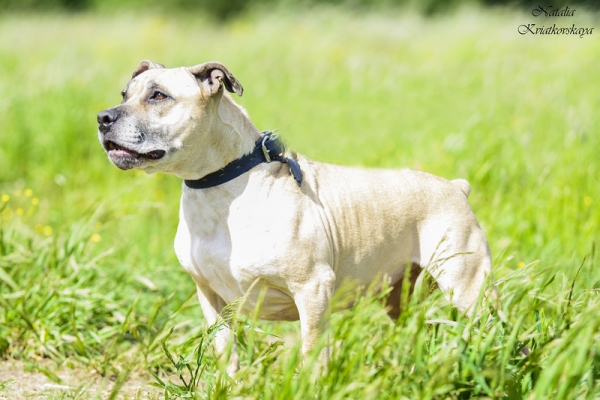 Дорис была вывезена из ужасных условий: с цепи на улице, где она жила всю свою жизнь и рожала щенков без остановки, как на конвеере. В конце концов она надоела хозяевам, ее перестали кормить в вывесили объявление на Авито "Злобная сука в дар, самовывоз". В приют Шереметьево Дорис приехала худенькой и растерянной, однако "злобной суки" не было и в помине. Дорис - замечательная контактная девочка! Очень милая и трогательная. Бульдожьего типа: коренастая и широкая. Прочесть полную историю этой собаки можно, перейдя по ссылке на форум ("Комментарии")